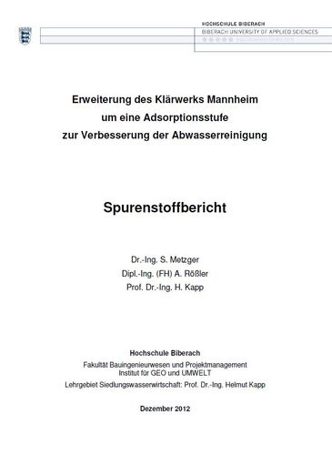 | Erweiterung des Klärwerks Mannheim um eine Adsorptionsstufe zur Verbesserung der Abwasserreinigung - Spurenstoffbericht | Berichte und Artikel | 2012 |