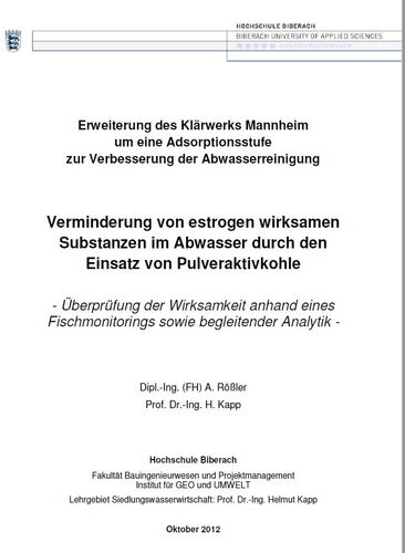 | Erweiterung des Klärwerks Mannheim um eine Adsorptionsstufe zur Verbesserung der Abwasserreinigung: Verminderung von estrogen wirksamen Substanzen im Abwasser durch den Einsatz von Pulveraktivkohle - Überprüfung der Wirksamkeit anhand eines Fischmonitorings sowie begleitender Analytik - | Berichte und Artikel | 2012 |