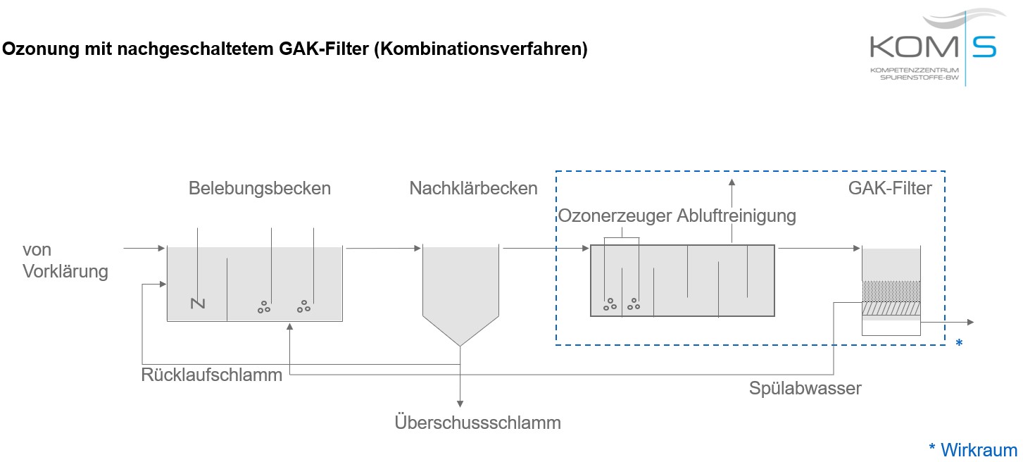 Grundsätzlich können die unterschiedlichen Verfahren miteinander kombiniert werden. Es gibt zahlreiche denkbare Verfahrenskombinationen. Insbesondere die Kombination von Verfahren mit adsorptiver- und oxidativer Wirkung (Ozonung mit nachgeschalteter GAK-Adsorption) ist sehr vielversprechend und wird bereits auf mehreren kommunalen Kläranlagen eingesetzt (z.B. Kläranlage Überlinger See). Durch die Kombination von zwei Verfahren kann die Ozonung im Kombinationsverfahren mit geringeren Ozondosierungen betrieben werden als im Einzelverfahren. Außerdem verlängert sich die Standzeit des GAK-Adsorbers durch die vorgeschaltete Ozonung und die GAK muss seltener ausgetauscht und regeneriert werden.